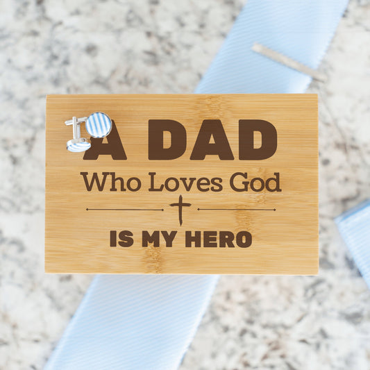 "A Dad Who Loves God is My Hero" Engraved Tie Gift Box: Includes Premium Tie, Tie Clip, and Matching Handkerchief