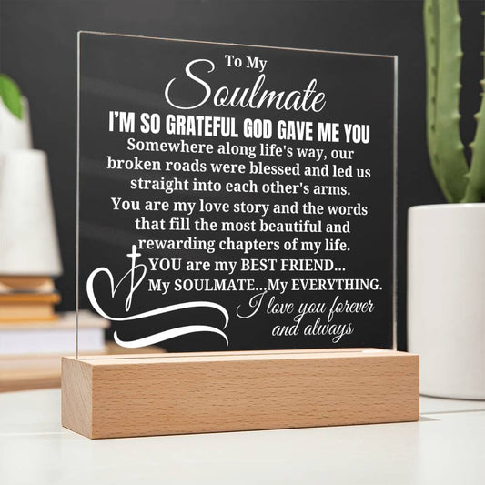 To My Soulmate "I'm so grateful God gave me you" Acrylic Plaque With Lighted Base