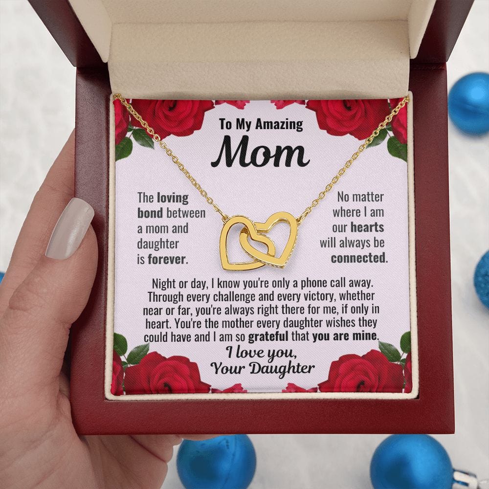 To My Amazing Mom "The loving bond between a mom and daughter is forever. No matter where I am our hearts will always be connected. Night or day, I know you're only a phone call away. Through every challenge and every victory, whether near or far, you're always right there for me, if only in heart. You're the mother every daughter wishes they could have and I am so grateful that you are mine." I Love You, Your Daughter